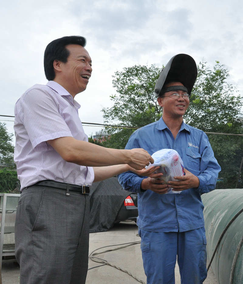 7月12日上午,縣委副書記、縣長孫云耀,縣委副書記孟柏干等縣領(lǐng)導(dǎo)冒著高溫到獨(dú)山DN1000自應(yīng)力管改造現(xiàn)場慰問供水公司一線職工,向供水管道安裝人員表示慰問,并送上防暑慰問品,叮囑大家繼續(xù)堅(jiān)守崗位,科學(xué)安排工作,合理調(diào)整作業(yè)時(shí)間,切實(shí)做好防暑降溫工作。集團(tuán)公司董事長倪阿泉等有關(guān)領(lǐng)導(dǎo)陪同慰問。
