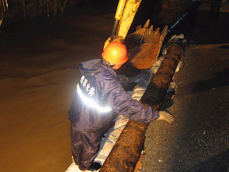 災情就是命令!集團接到縣防指命令后,立即啟動大口徑管道應急搶修預案。根據受災情況,集團迅速派出由20多名人員組成的專業搶修隊伍,隨帶各種專業搶修工具,冒著大雨趕赴受災點,并于下午16時進入現場開始搶修。經過8個小時的持續作戰,搶修隊克服重重困難,終于搶通供水管道。然而,凌晨3點多,敖紅了雙眼的搶修人員卻再次接到任務,立即趕赴王壇鎮幫助王壇鎮水廠解決因停電造成管網無法輸水的問題,于凌晨5點恢復供水。