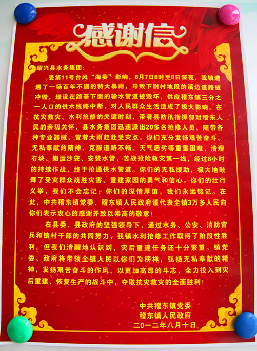 8月17日,中共稽東鎮(zhèn)黨委、稽東鎮(zhèn)人民政府專程為集團(tuán)送來感謝信和錦旗,衷心感謝集團(tuán)在第11號臺風(fēng)“海葵”期間,發(fā)揚艱苦奮斗、無私奉獻(xiàn)精神,第一時間成功搶修被毀壞的輸水總管,保障了該鎮(zhèn)人民群眾的飲水安全。