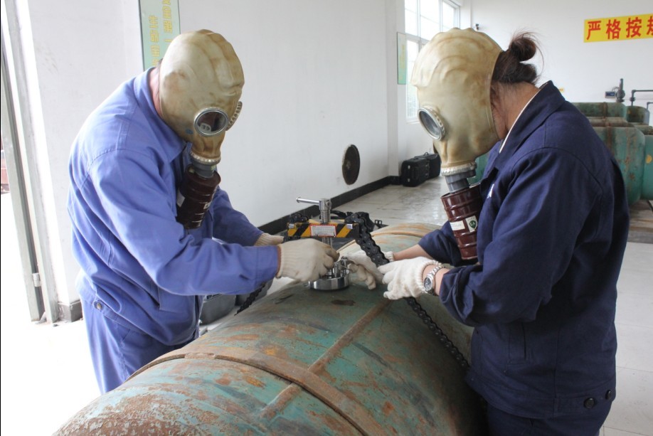 9名員工參與了此次演練。兩人一組,從新舊空氣呼吸器和防化服的正確穿戴及使用、泄氯堵漏工具的使用以及氯瓶拆裝三個(gè)項(xiàng)目進(jìn)行技術(shù)演練。演練從實(shí)戰(zhàn)出發(fā),參演人員各司其職,按照“正確、迅速”的原則,圓滿地完成了本次演練任務(wù),最后公司運(yùn)行部副經(jīng)理對參演人員按標(biāo)準(zhǔn)進(jìn)行了評分考核并發(fā)表總結(jié)講話。