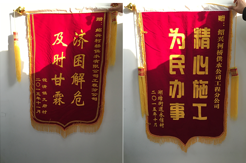 1229日下午,公司相繼收到湖塘街道永信村和錢清九巖村村委送來的“濟困解危,及時甘霖”和“精心施工,為民辦事”兩面錦旗,對工程分公司工作人員辛勤勞動、甘于奉獻的工作精神表示贊賞和感謝。